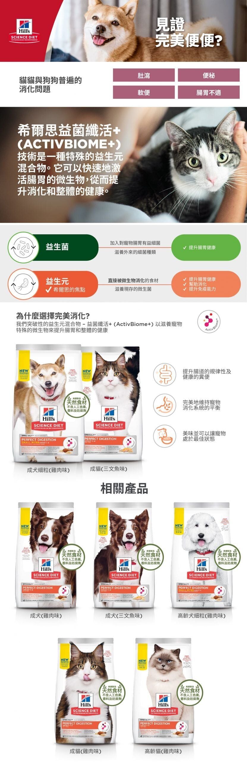益生纖維對健康至關重要,它是腸道微生物菌叢中,數百萬微生物的食物來源。希爾思突破性的ActivBiome+ (益菌纖活+科技) 即益生纖維混合配方,促進寵物獨特的微生物菌叢,達到消化及整體健康
