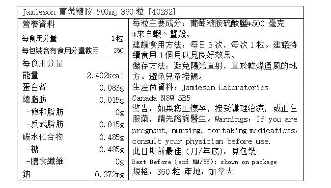 Jamieson - 關節健骨寶 500mg 葡萄糖胺膠囊 360粒