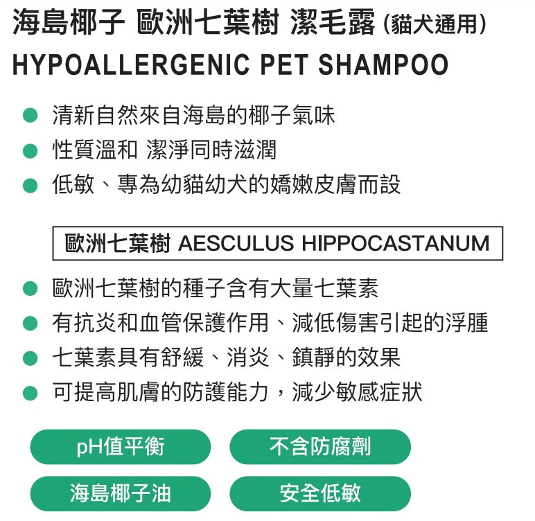 歐洲七葉樹潔毛露選用來自海島的椰子油,清新自然的椰子香,而椰子油含有豐富的抗氧化物,有助毛孩保健皮膚;添加了歐洲七葉樹裡含七葉素,能對皮膚起紓緩、消炎、鎮靜作用,對抗炎和保護血管亦有非常大作用!另外,七葉素還可以減低因受傷而引起的浮腫,紓緩因外界刺激或因環境變化所引起的泛紅、痕癢等不適,並提高肌膚防護能力,減少皮膚紅腫和敏感,特別適合幼貓狗、敏感及受損的嬌嫩肌膚。產品成分天然,PH值平衡,不含肥皂和防腐劑,安全低敏,毛孩可安心使用。 使用方法:先搖勻,打濕毛孩毛髮,取適量產品於掌心,揉成起泡,溫柔按摩毛孩全身包括手腳等位置,然後用清水徹底沖洗乾淨 注意事項:– 請勿洗進毛孩的眼睛– 請放置陰涼處,避免陽光直接照射 Read more