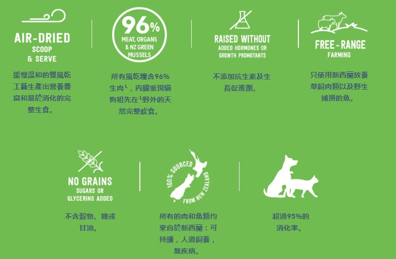 產品特性 高肉含量不含BPA(雙酚A)、卡拉膠、TSPP、人工黏合劑只選用新西蘭放養草飼肉類不含抗生素、激素以及生長促進劑不含穀物、甘油或糖所有的肉類都是來自新西蘭:可持續,人道飼養,無疾病緩慢温和的雙風乾工藝呈現出注重營養和易於消化的完整生食超過95%的消化率 成份: 羊肉,水,羊肺,羊腎,羊肝,鷹嘴豆,羊草胃,羊心,新西蘭綠唇貽貝,羊骨,DL-蛋氨酸,海帶乾,礦物質,牛磺酸,維他命 營養分析: 保證成分分析 粗蛋白質(最少) 9.5% 粗脂肪 (最少) 6.0% 粗纖維 (最多) 2.0% 水份 (最多) 78.0% 灰質 (最多) 3.0%... Read more